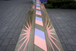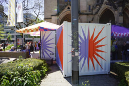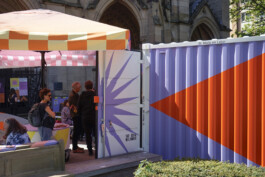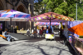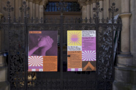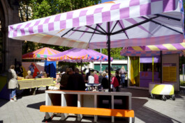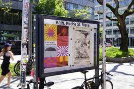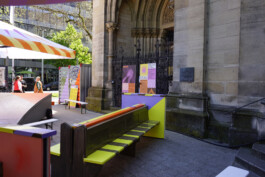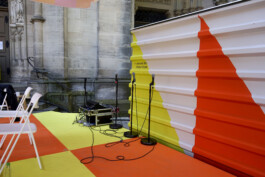 Außenraum vor der Sr. Maria Kirche in Stuttgart von umschichten wegen der Sanierung der Kirche. Zweitägige Auftaktveranstaltung mit Ausstellungen, Vorträgen, Workshops und Interventionen.